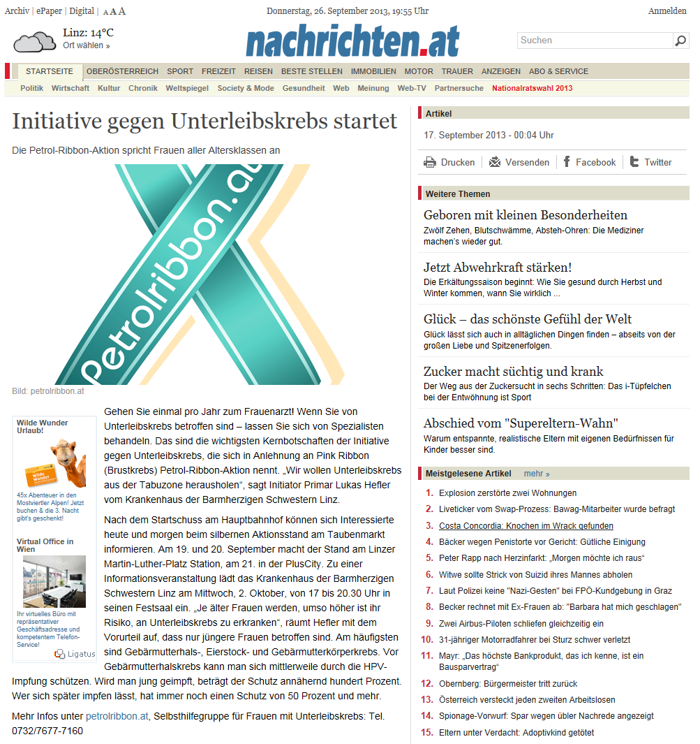 - OÖNachrichten Web, 17.9.2013Initiative gegen Unterleibskrebs startet