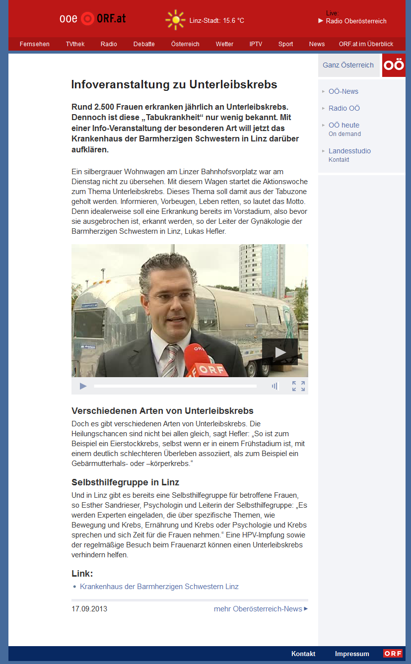 - OOE ORF.at, 17.9.2013Infoveranstaltung zu Unterleibskrebs